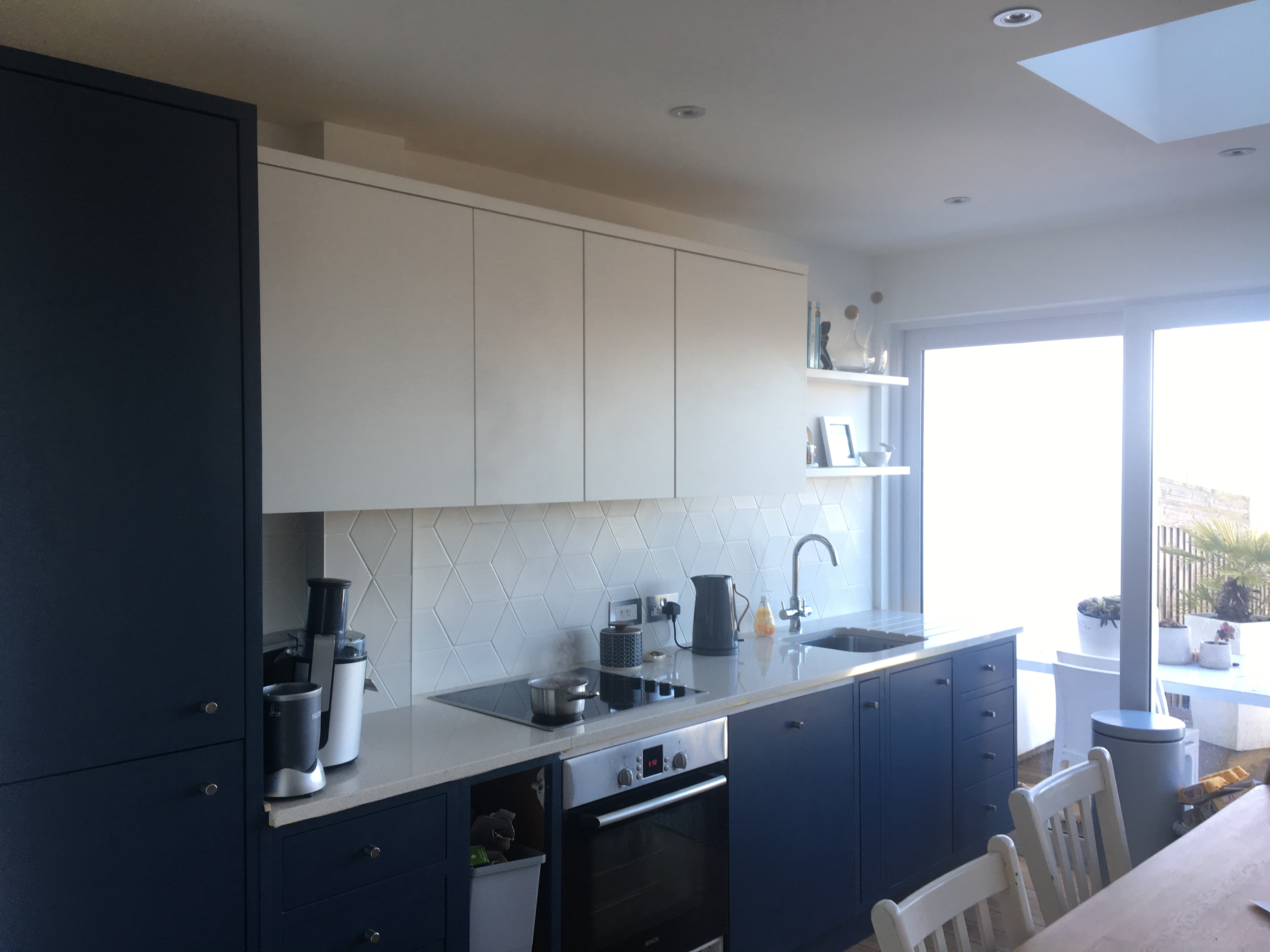 Rescued these old kitchen cupboards from a skip. After a good clean, some new doors and handles, and a good lick of paint, the almost finished kitchen is looking good – another very happy customer.